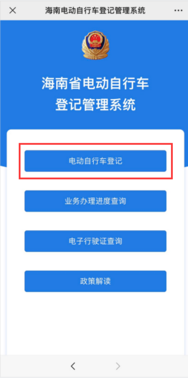 1. Visit the “Hainan Traffic Police E-Bike Registration Management System" from the “海南交警” WeChat public account.
